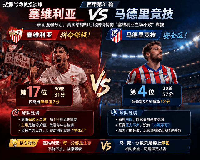 先看最基本的背景。塞维利亚30轮只拿到31分,排在第17位,仅仅高出降级区2分;马竞则是57分排第4,领先第5名贝蒂斯12分,联赛抢四主动权很稳。单看积分,像是强弱分明;